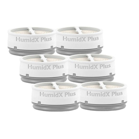 6 pack of waterless humidification capsules for Resmed AirMini CPAP machine. These capsules are for use with the AirFit nasal and nasal pillows mask systems. HumidX Plus can be used in dry and high altitude environments where humidity is low, such as Airplane travel.